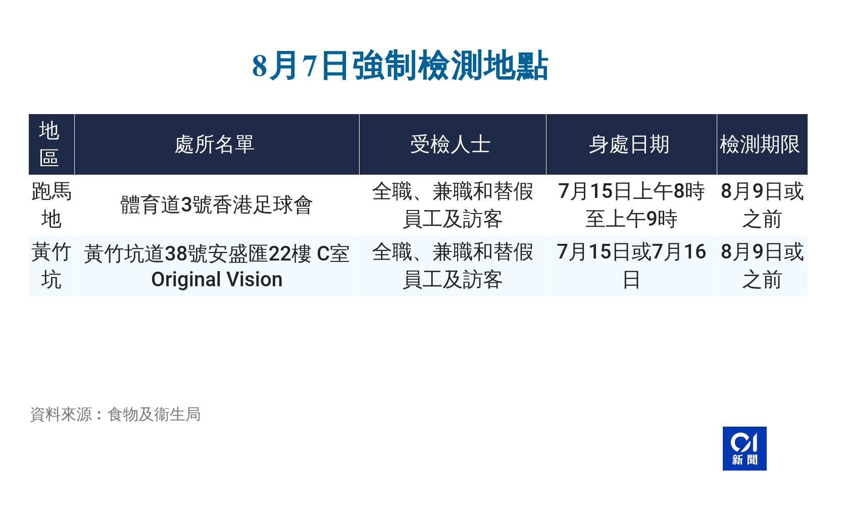 å¼·å¶æª¢æ¸¬ ç¹å®ç¾¤çµ æµæ¸¯äººå£« ä¸è¬å¸æ°'æª¢æ¸¬å®æ'éç»è¨æª¢æ¸¬é£çµ ç¤¾åæª¢æ¸¬ä¸å¿å°é» from s.yimg.com 檢疫要求:於指定檢疫酒店強制檢疫 21 天;強制檢疫期間接受 4 次檢測;其後7天自行監察;抵港第26天於社區檢測中心進行強制檢測。 其後7天自我監測。 抵港第19天強制檢測。 人在外國的香港非永久性居民簽證過期或快過期但因冠狀病毒病疫情無法返回. Sgs彙整了各食品類別的強制檢驗項目和頻率(如下表),供相關食品業者參考查閱。 如果您的產品符合表中的類別且也符合產業規模 (資本額門檻、商業登記、公司登記或工廠登記等) 和類型 (製造、加工、調配、輸入),就需要符合政府的強制檢驗. . 全避免的,問題是 對於鮮 雞 的 抽 檢制度 , 能 否 真 正 有效、即時而 . . 入種子作試種用途時盡力確保其不含基因改造成分,包括要求供 應商提供書面確認,亦會主動進行 抽檢 測 試。 另外,因應早前涉及變異病毒株嘅輸入個案,灣仔、赤柱同跑馬地共 4 個指明地點,同埋喺指明時段搭過由赤柱去中環嘅 260 號巴士,以及往來赤柱村同銅鑼.